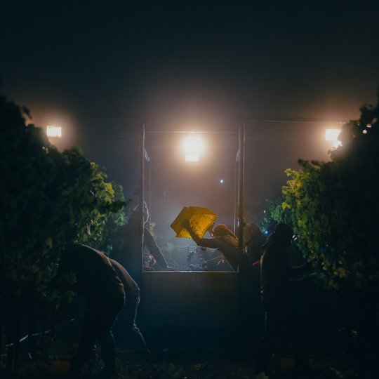 Υπό το φως των φώτων ενός τρακτέρ, οι εργάτες του αμπελώνα μαζεύουν με το χέρι Pinot Noir στον δροσερό, ομιχλώδη αέρα της μεσάνυχτας στο Sanford & Benedict Vineyard στο Sta. Rita Hills, μια αμερικανική αμπελουργική περιοχή (AVA) που βρίσκεται στο δυτικό άκρο της κοιλάδας Santa Ynez στην περιοχή κρασιού της κεντρικής ακτής της Καλιφόρνιας. Ένας εργάτης προσθέτει τη συμβολή του στο πίσω μέρος του τρακτέρ, μια κασκάδα Pinot Noir που πέφτει από το καλάθι του.