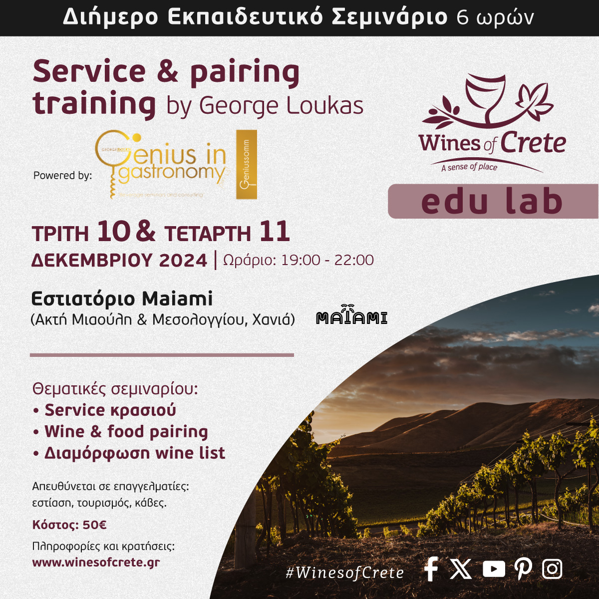 Διήμερο εκπαιδευτικό σεμινάριο στο κρασί, διάρκειας 6 ωρών από το Wines of Crete και την Genius in Gastronomy. Τρίτη 10 & Τετάρτη 11 Δεκεμβρίου 2024 στα Χανιά.