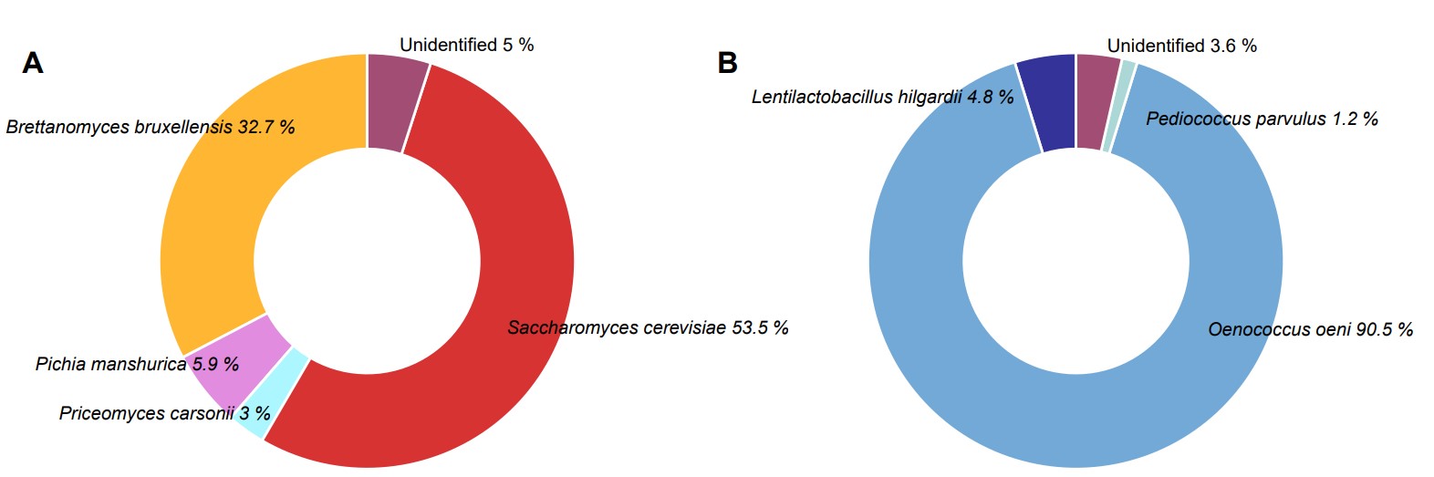 In recent years, the frequency of occurrence of mousy off-flavours in wines has increased. This could be caused by the significant decrease in sulphur dioxide addition during processing, the increase in pH or even the trend for spontaneous fermentation in wine. This off-flavour was associated with Brettanomyces bruxellensis or lactic acid bacteria metabolisms. Three N-heterocyclic compounds (APY, ETHP, ATHP) were described as involved in mousiness perception. Thus far, no study addressed the variability in that N-heterocycles production according to microorganism strains from different species. Twenty-five wines presenting mousy off-flavour were analysed. In total, 252 bacteria with 90.5 % of Oenococcus oeni and 101 yeast strains with 53.5 % of Saccharomyces cerevisiae were isolated and identified. Their capacity to produce mousy compounds was investigated using Stir Bar Sorptive Extraction-Gas Chromatography-Mass Spectrometry (SBSE-GC-MS) and a standardised N-heterocycle assay medium. While four and three species of yeast and bacteria, respectively, were isolated from mousy wines, only three species of microorganisms were associated with N-heterocycles production: B. bruxellensis, Lentilactobacillus hilgardii and Oenococcus oeni. The screening was then extended to collection strains for these three species to improve their genetic representativity. Our results show that the levels and the ratios of the three N-heterocycles present huge variations according to the species. In addition, it has been shown that in most mousy wines, B. bruxellensis was not found. Finally, an interesting correlation between ATHP and ETHP was identified.