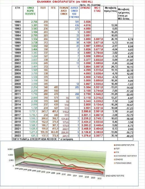 Ακολουθεί διαχρονικός πίνακας της ελληνικής οινοπαραγωγής 1990-2023, σύμφωνα με τον οποίο διαπιστώνεται μείωση της οινοπαραγωγής από το 1990 κατά 40% περίπου σε μέσους όρους.