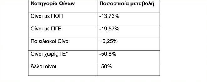 Στα επιμέρους χαρακτηριστικά της οινοπαραγωγής 2023/2024, παρατηρούνται ανά κατηγορία οίνου πτωτικές μεταβολές ως προς τον όγκο σε όλες τις κατηγορίες πλην των ποικιλιακών οίνων, σε σύγκριση με την αντίστοιχη του 2022/2023, σύμφωνα με τον πίνακα που ακολουθεί: