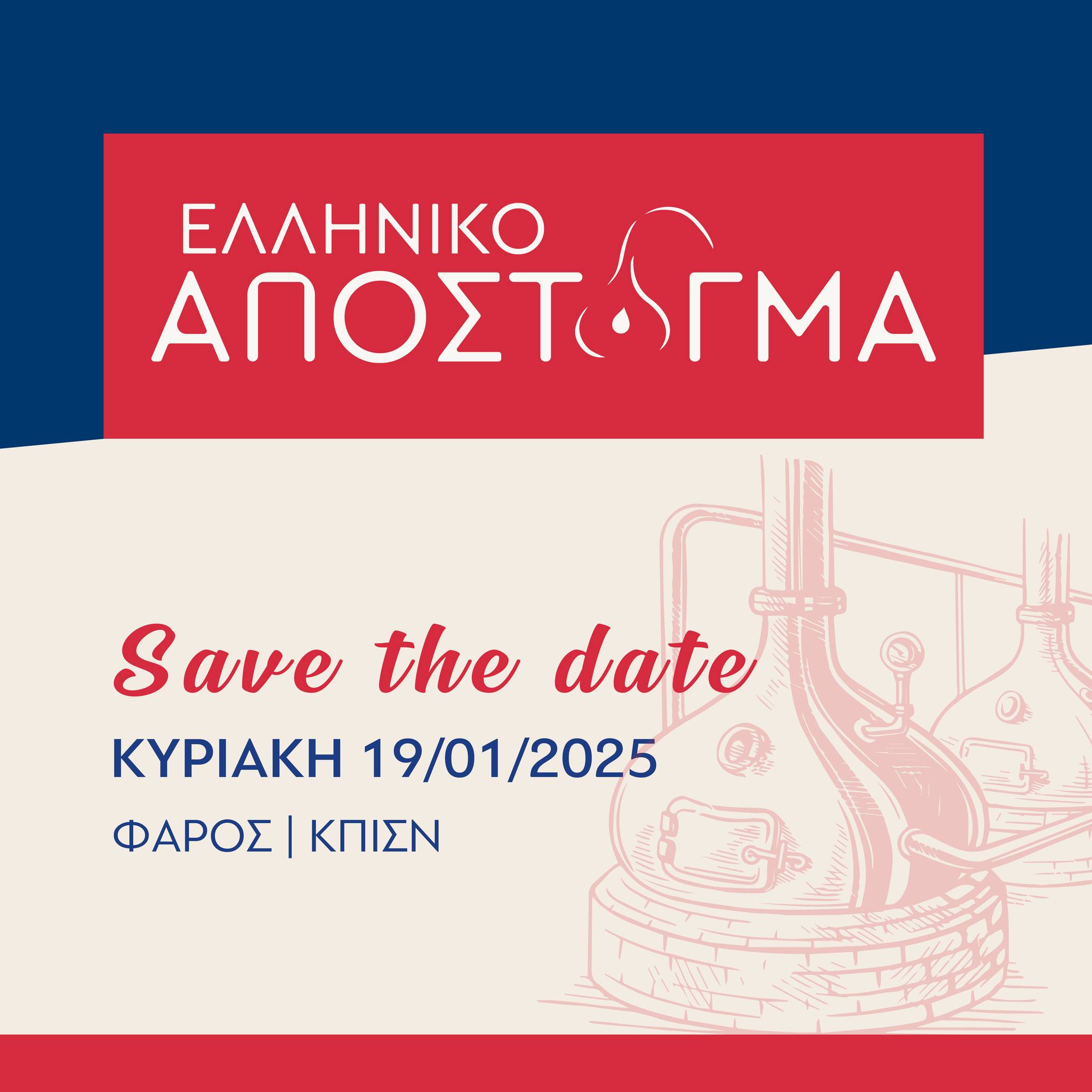 Η έκθεση «Ελληνικό Απόσταγμα» είναι η μοναδική εκδήλωση γευστικής δοκιμής αφιερωμένη αποκλειστικά στα ελληνικά αποστάγματα όπως το ούζο, το τσίπουρο, η τσικουδιά, το μπράντι και τα αποστάγματα σταφυλής, όλα επώνυμα και εμφιαλωμένα. Διοργανώνεται φέτος για 8η φορά, στις 19 Ιανουαρίου 2025 στο Φάρο του Κέντρου Πολιτισμού Ίδρυμα Σταύρος Νιάρχος, με ώρες λειτουργίας 11:30 - 15:30 & 16:00 - 20:00.