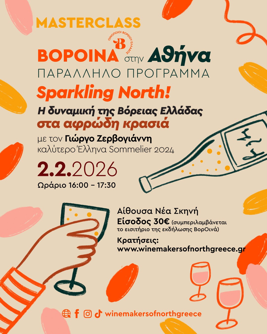 *Η είσοδος στην ημερίδα είναι δωρεάν, με το γενικό εισιτήριο των ΒορΟινών. - 16:00 – 17:30 Masterclass «Sparkling North! Η δυναμική της Βόρειας Ελλάδας στα αφρώδη κρασιά» με τον Γιώργο Ζερβογιάννη, καλύτερο Έλληνα Sommelier 2024