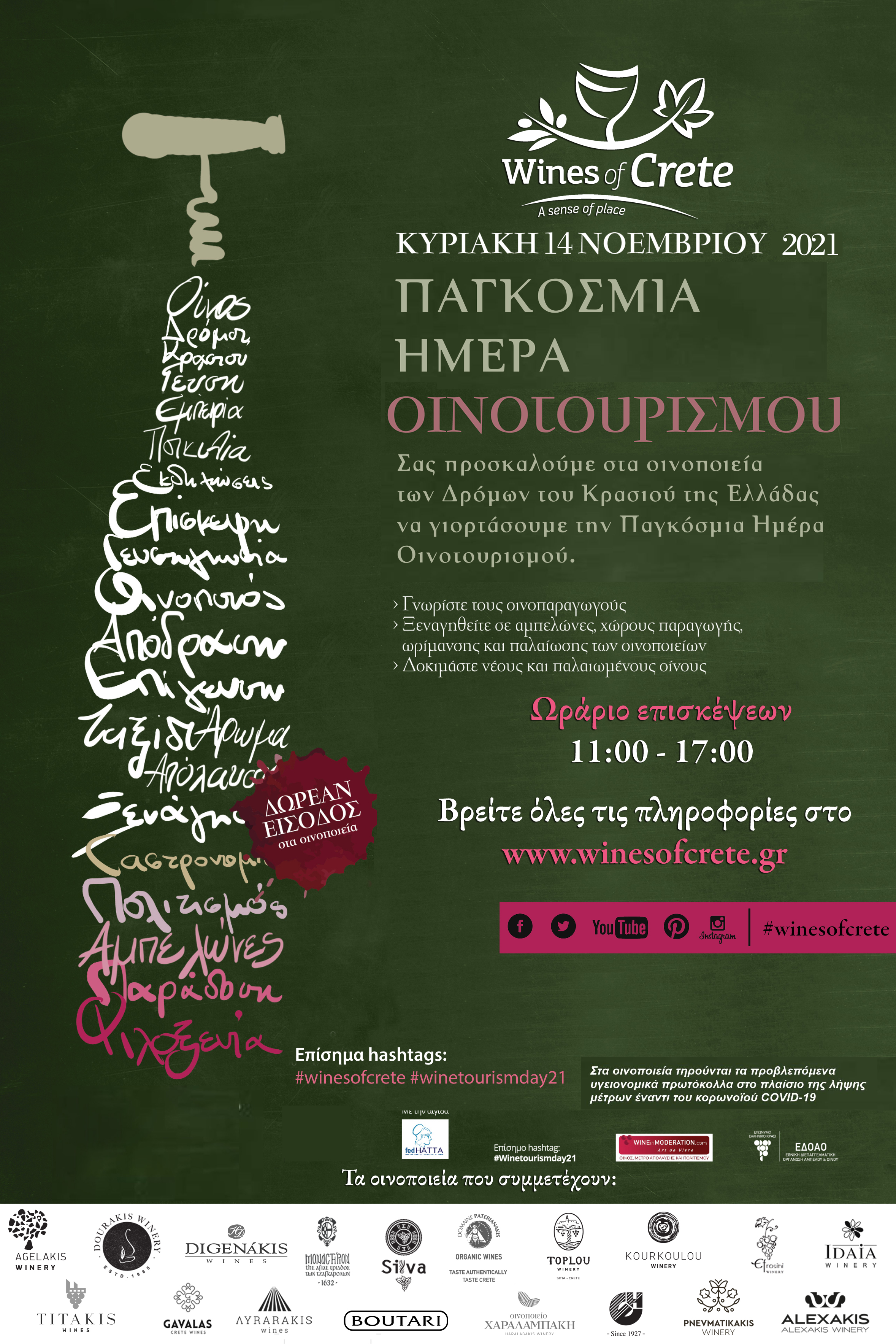 Την Κυριακή 14 Νοεμβρίου 2021 τα οινοποιεία των Δρόμων του Κρασιού της Ελλάδας, συμμετέχουν μαζί με εκατοντάδες άλλα οινοποιεία της Ευρώπης, στην Παγκόσμια Ημέρα Οινοτουρισμού και σας προσκαλούν να γιορτάσετε μαζί τους.