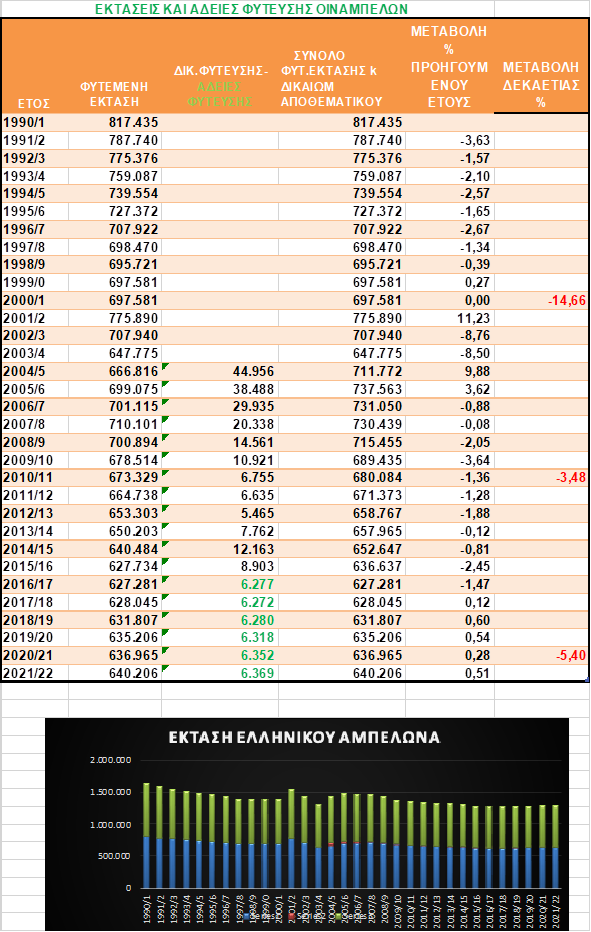 Ακολουθεί πίνακας με τις διαχρονικές μεταβολές του ελληνικού αμπελώνα.