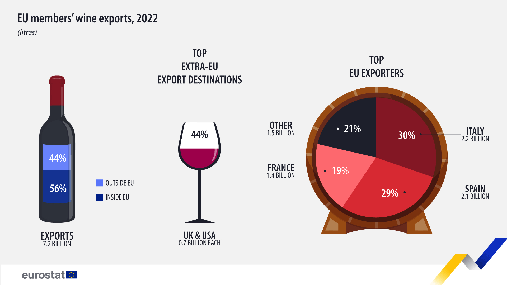 In 2022, the sold production of wine (including sparkling wine, port and grape must) in the European Union was 16.1 billion liters. The three main producers - Italy, Spain and France - together account for 83% of the total. Italy and Spain each contributed almost 5 billion litres (with 62% of total production sold in the European Union), while France produced 3.4 billion litres, or 20%. Italy was also by far the leading European wine exporter, with 2.2 billion liters in 2022, representing 30% of the EU total. This is followed by Spain (2.1 billion litres, 29%) and France (1.4 billion litres, 19%): this is what the latest data released by Eurostat, the statistical office of the European Union, tell us, which provide a snapshot of the state of the art of wine in our continent.